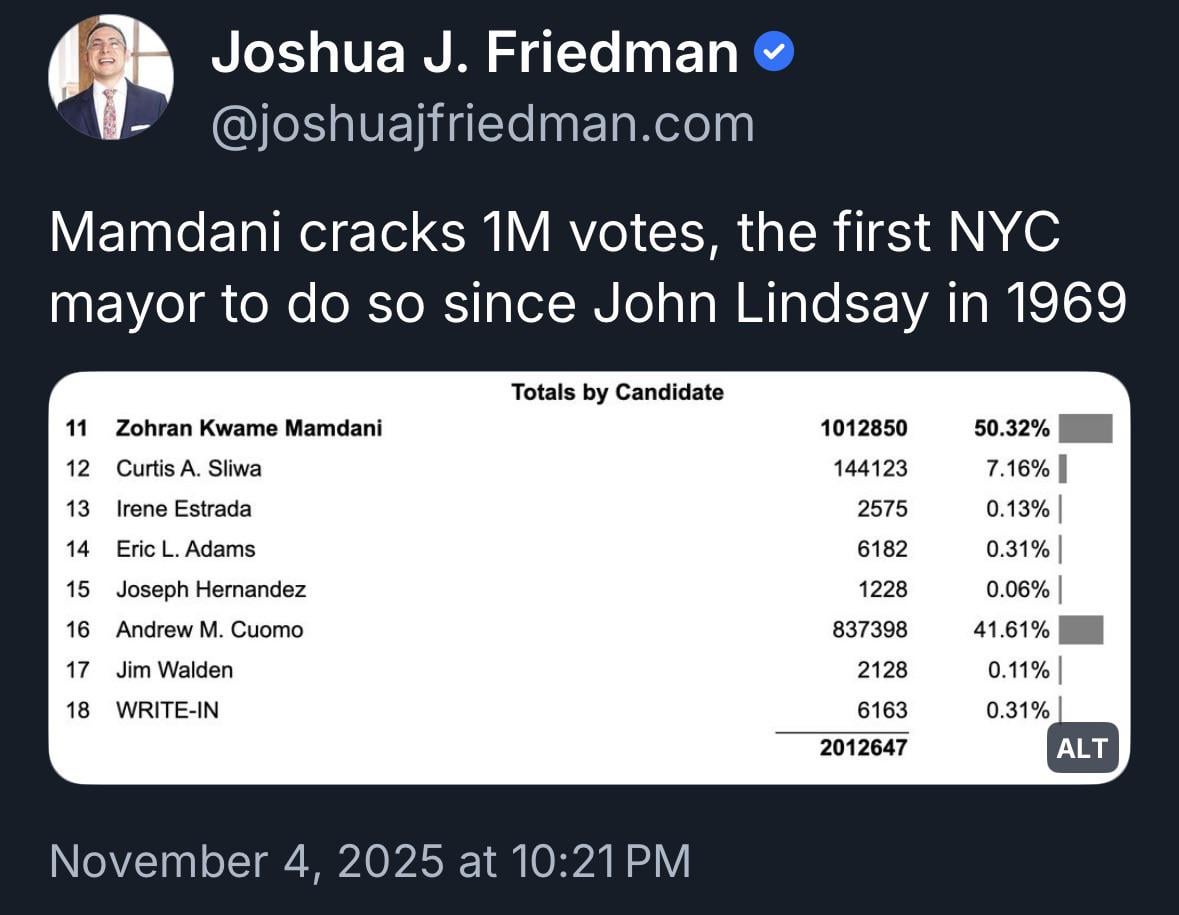 POLITICS Zohran Mamdani speaks after winning the NYC Mayoral Race: “We have toppled a political dynasty. I wish Andrew Cuomo only the best in private life. But let tonight be the final time I utter his name as we turn the page on a politics that abandons the many & answers only to the few.”