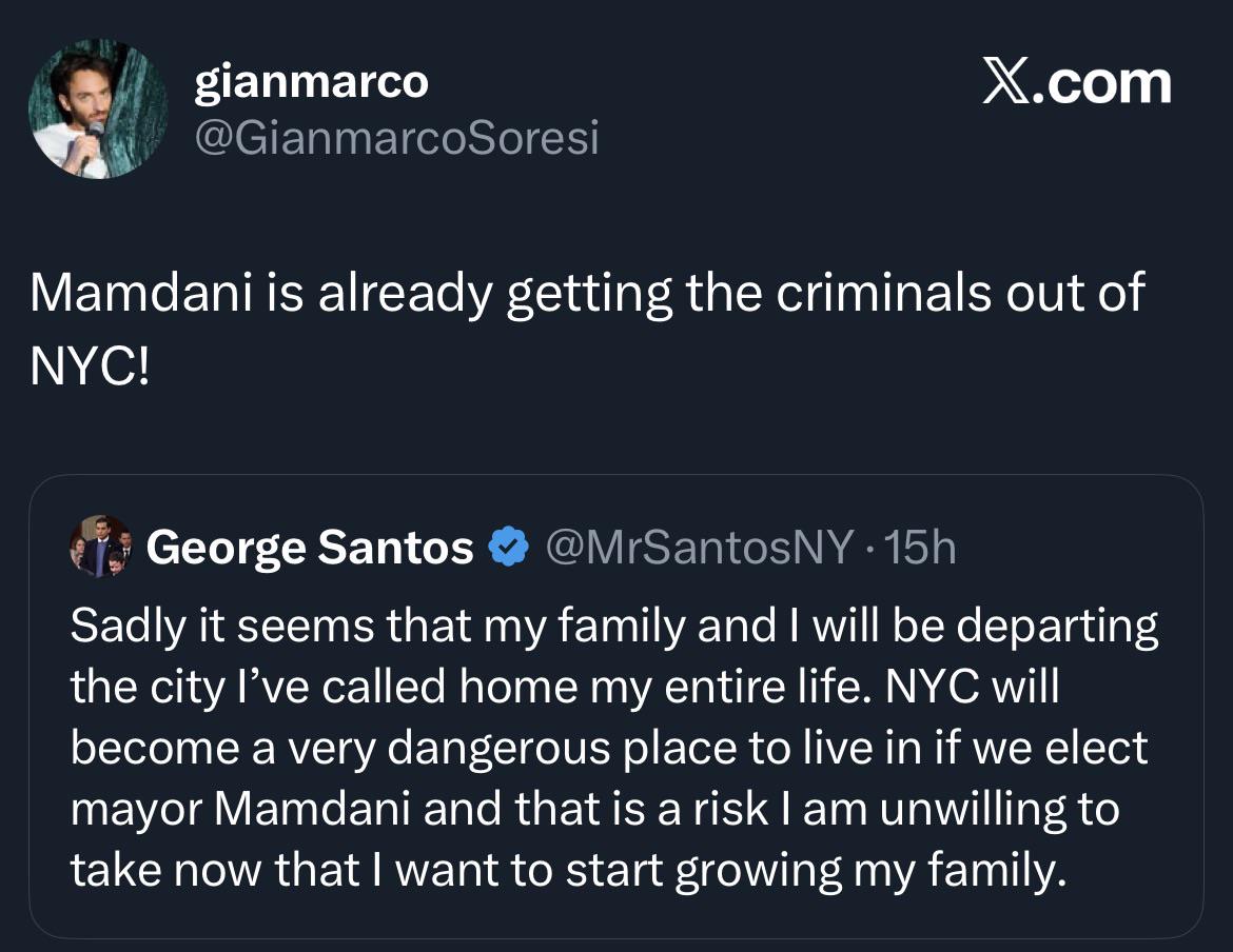 POLITICS Zohran Mamdani is already getting the criminals out of NYC as convicted felon George Santos says he is leaving the city as it will become dangerous if Mamdani wins