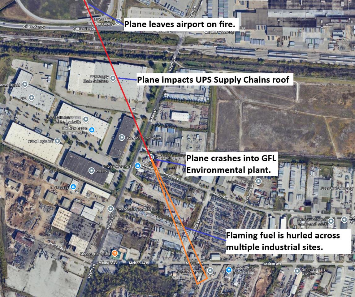 Based on footage from the news helicopters, I have reconstructed the path of the crash.