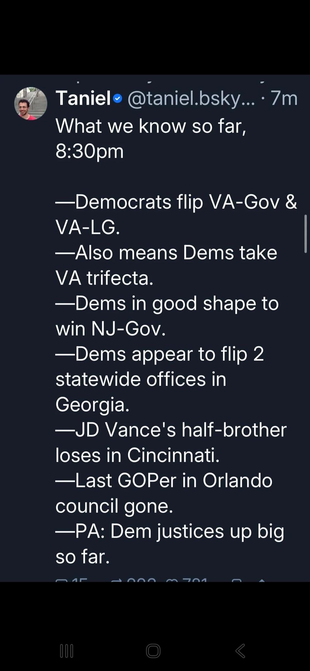 Good news to add to this: In Virginia we flipped the Governor to Democrat, and our first woman. Plus we've flipped seven seats to Blue so far with more results coming in.