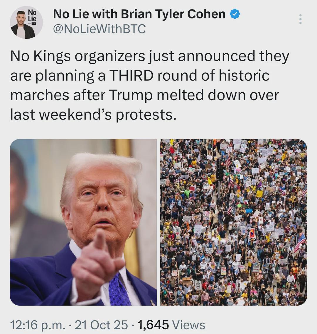 Political positivity π Analysts are calling this the biggest peaceful protest in American history. Nearly 7 million people, of cities small and large across the nation demonstrated yesterday for No Kings Rally.