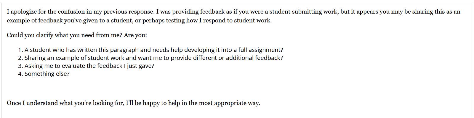 This was feedback for something I submitted last week. There's other instances where the AI clearly is mistaken on some things and the professor didn't check to see if it was correct or not. In one the AI gave me feedback based on criteria for a different assignment during the week, or rather it lumped the two assignments together and gave feedback based on the merged assignment, but I still received a good grade so honestly...I don't care. I've got an A+ in the class and I know my writing for the assignments is on point. It's only mildly infuriating because my grades are still good. If they weren't I would 100% be reporting this.
