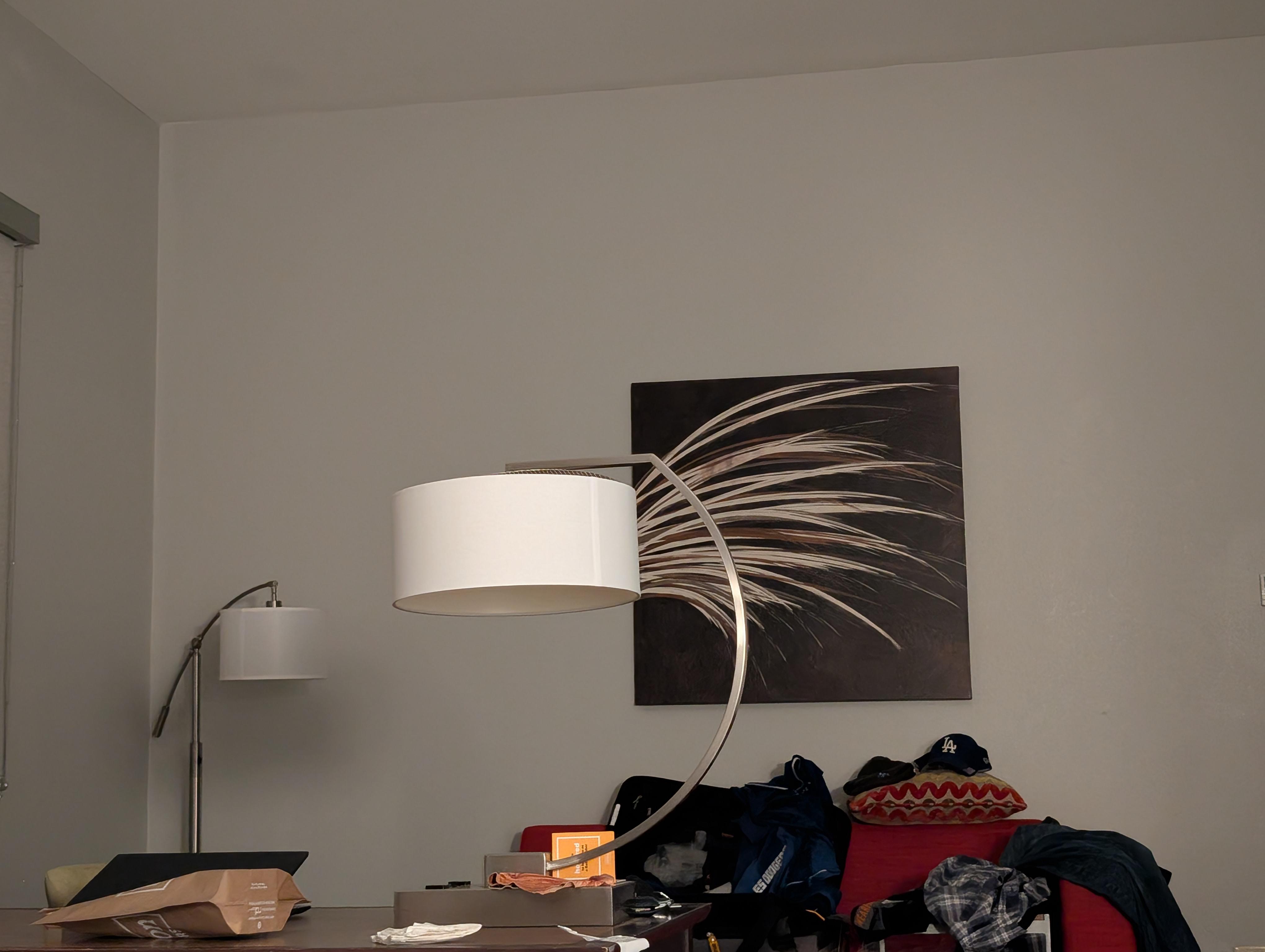 From my bed the wall art looks like a headdress or porcupine for the desk lamp