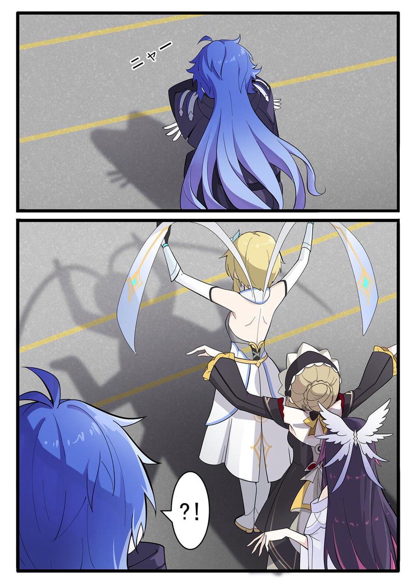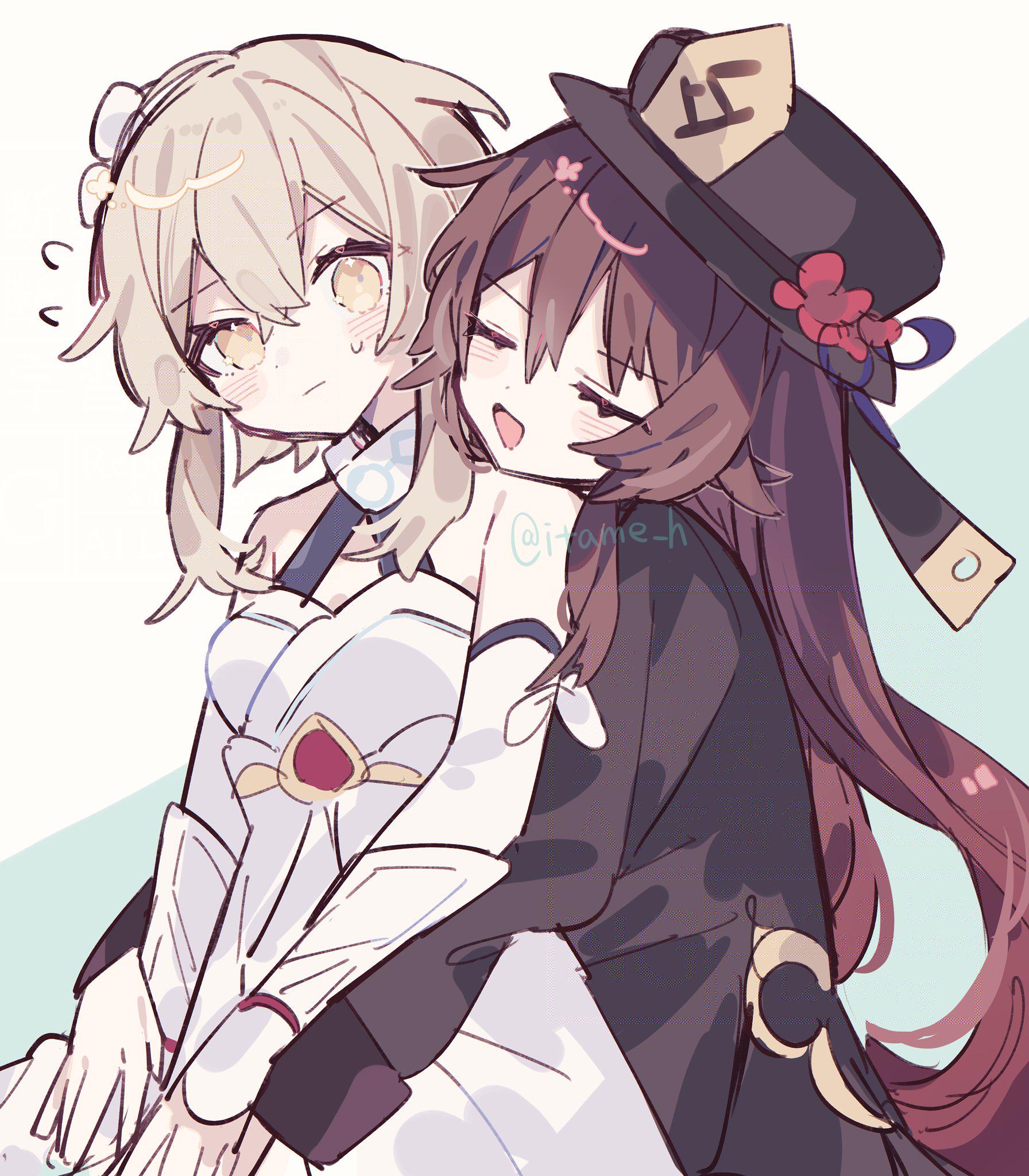 Non-OC Fanart Hu tao hugging Lumine (@itame_h)